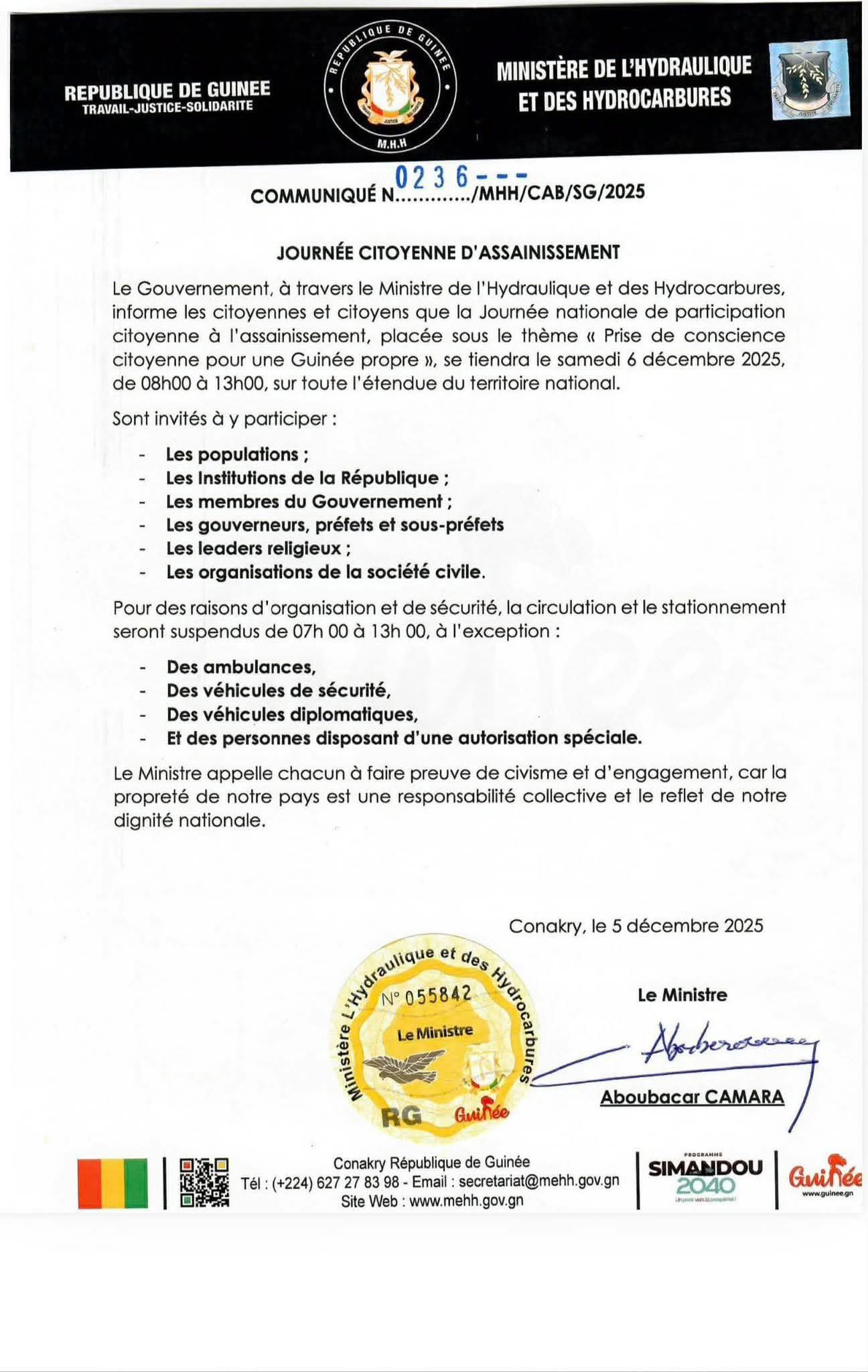 Dans un communiqué publié par le Ministère de l’Hydraulique et des Hydrocarbures, les autorités annoncent la tenue, ce samedi 6 décembre 2025, d’une Journée citoyenne de participation à l’assainissement sur toute l’étendue du territoire national. Placée sous le thème « Prise de conscience citoyenne pour une Guinée propre », cette initiative vise à impliquer directement les populations dans la lutte contre l’insalubrité.
