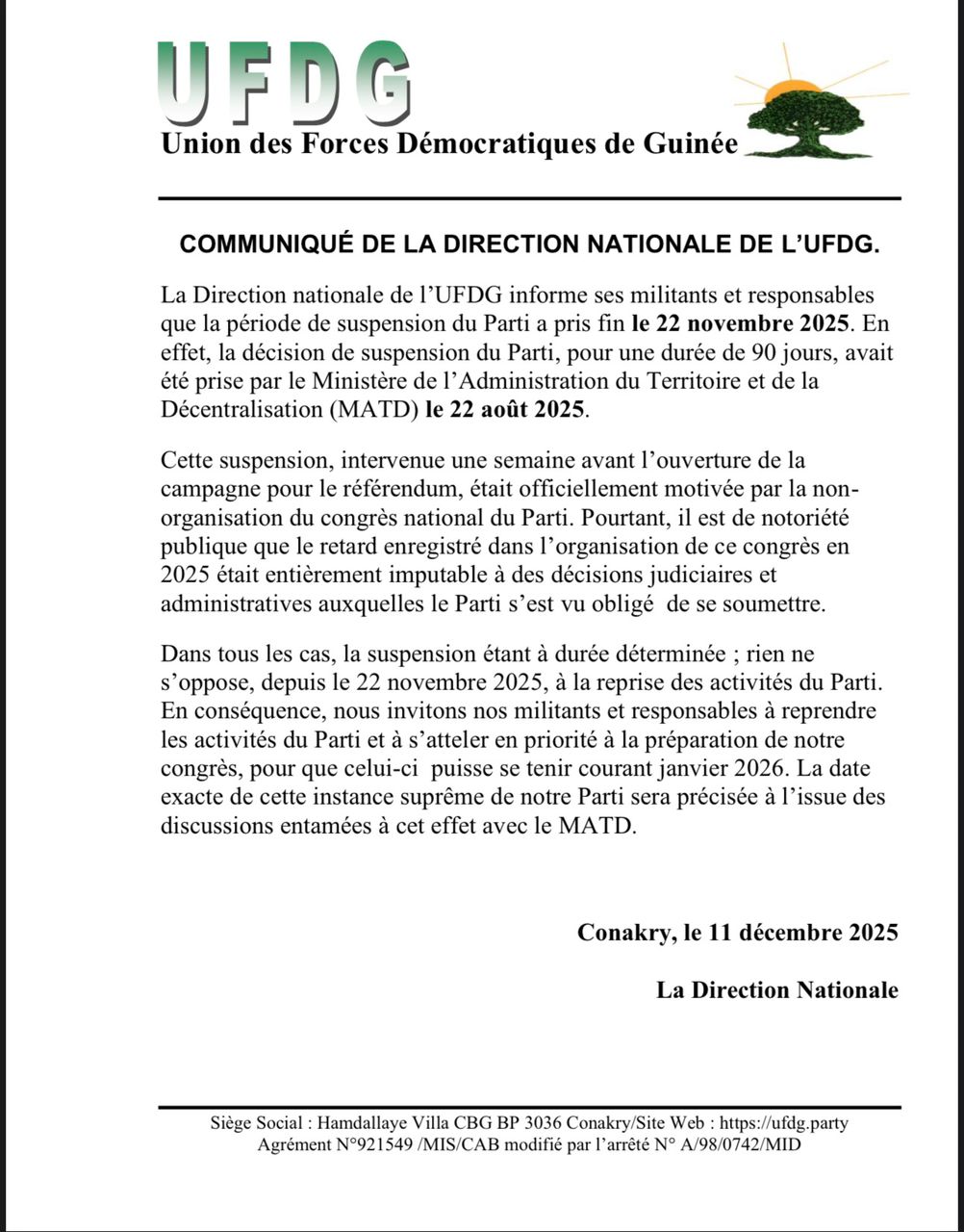 L’UFDG annonce la levée de la suspension de 90 jours décidée par le MATD et invite ses militants à reprendre les activités politiques. Le parti prépare désormais son congrès, prévu courant janvier 2026, dont la date définitive sera fixée après les échanges engagés avec le ministère.