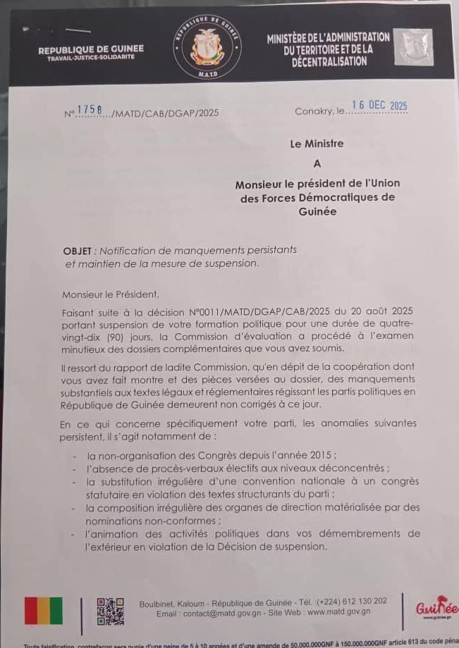 Dans un courrier daté du 16 décembre 2025 et adressé au président de l’UFDG, Cellou Dalein Diallo, le ministre Ibrahima Kalil Condé rappelle que la décision de suspension prise le 20 août dernier pour une durée de 90 jours reste en vigueur. La lettre, référencée N°1758/MATD/CAB/DGAP/2025, s’appuie sur les conclusions d’une commission chargée d’évaluer les pièces complémentaires fournies par le parti.