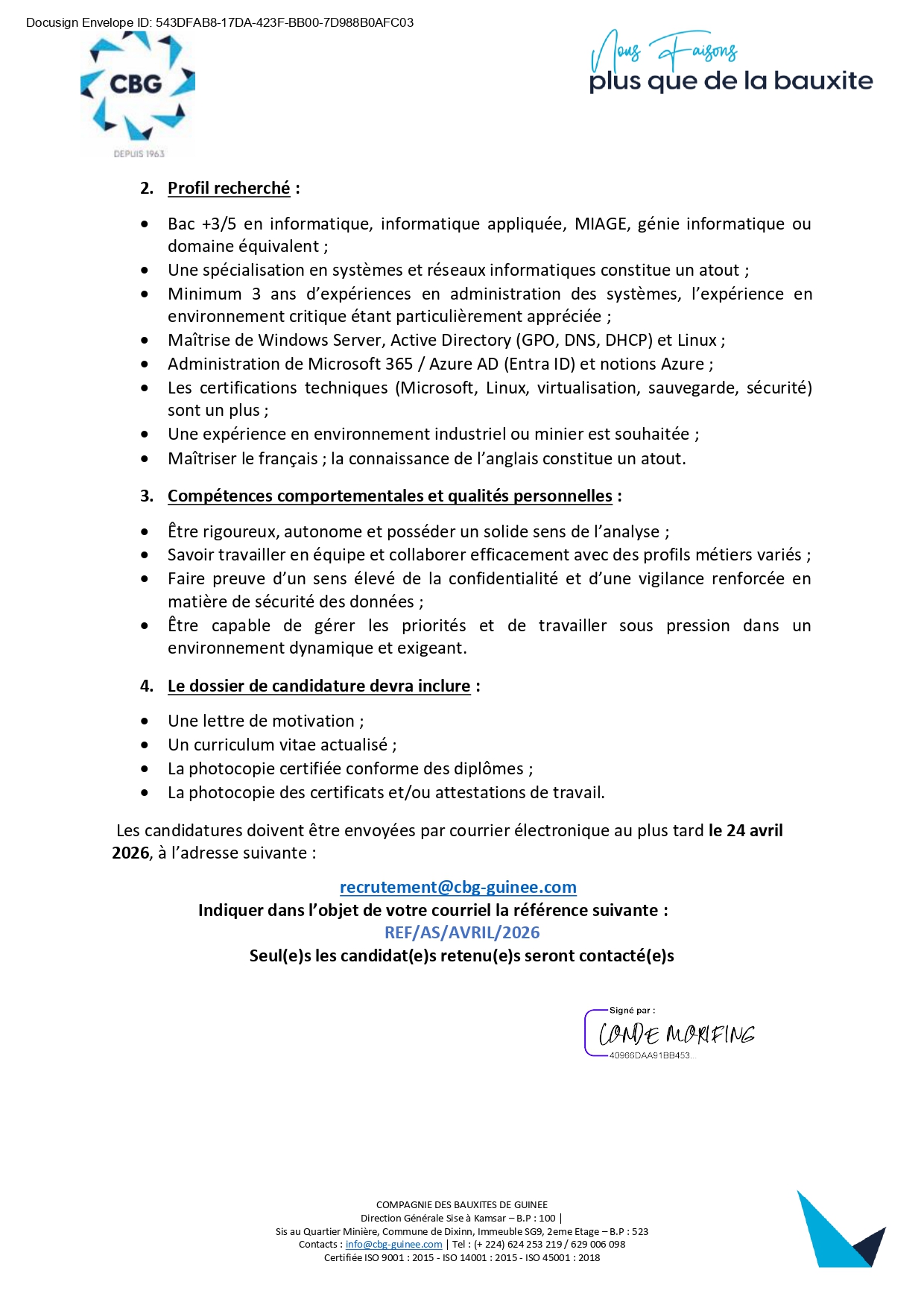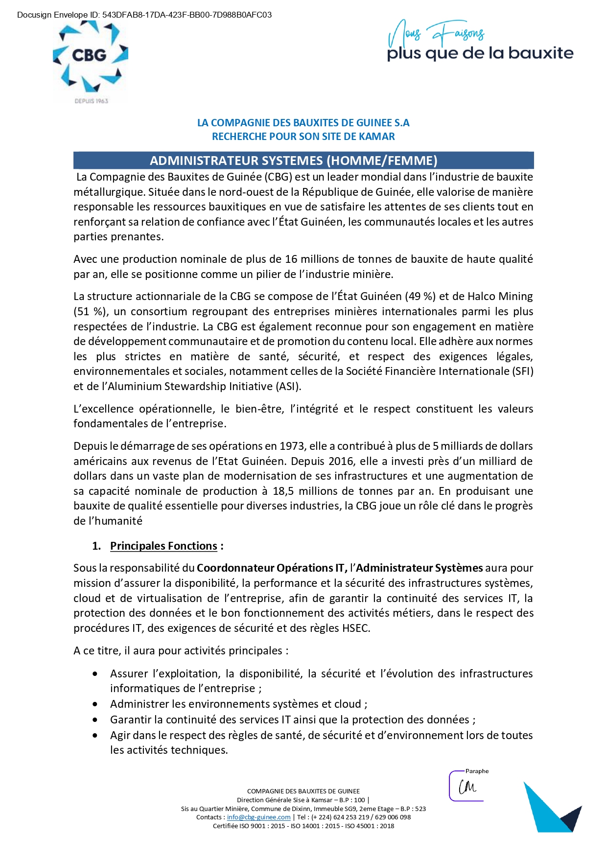 La Compagnie des Bauxites de Guinée (CBG) est un leader mondial dans l’industrie de bauxite métallurgique. Située dans le nord-ouest de la République de Guinée, elle valorise de manière responsable les ressources bauxitiques en vue de satisfaire les attentes de ses clients tout en renforçant sa relation de confiance avec l’État Guinéen, les communautés locales et les autres parties prenantes.