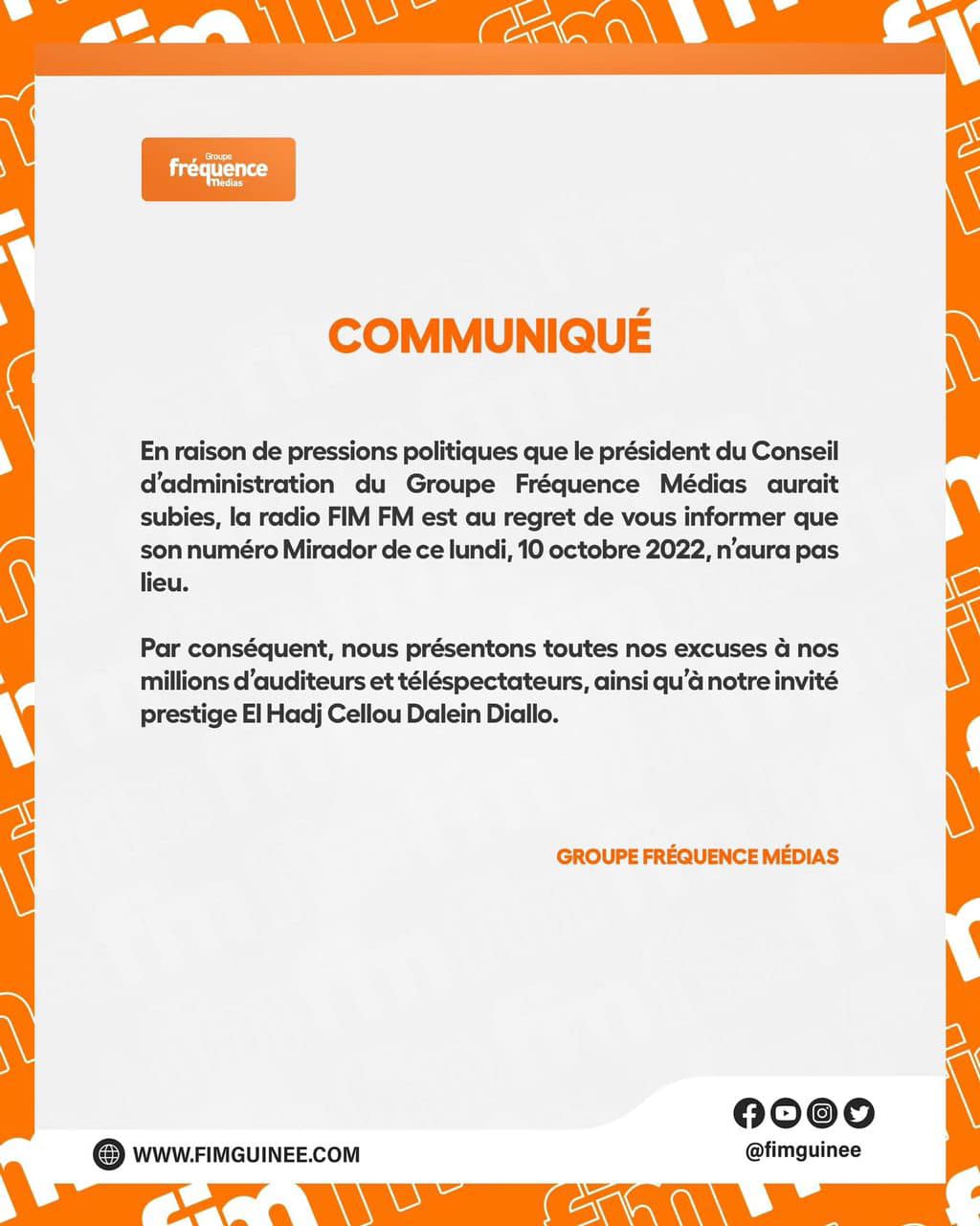 Ce lundi 10 octobre 2022, nos confrères de Fim Fm dans son émission “le Mirador” devait avoir pour invité en ligne, le président et leader de l’UFDG, Elhadj Cellou Dalein Diallo. Mais à la surprise de tous, cette émission fut annulée à cause des préssions politiques que le président directeur générale (PDG) a reçus (voir communiqué).