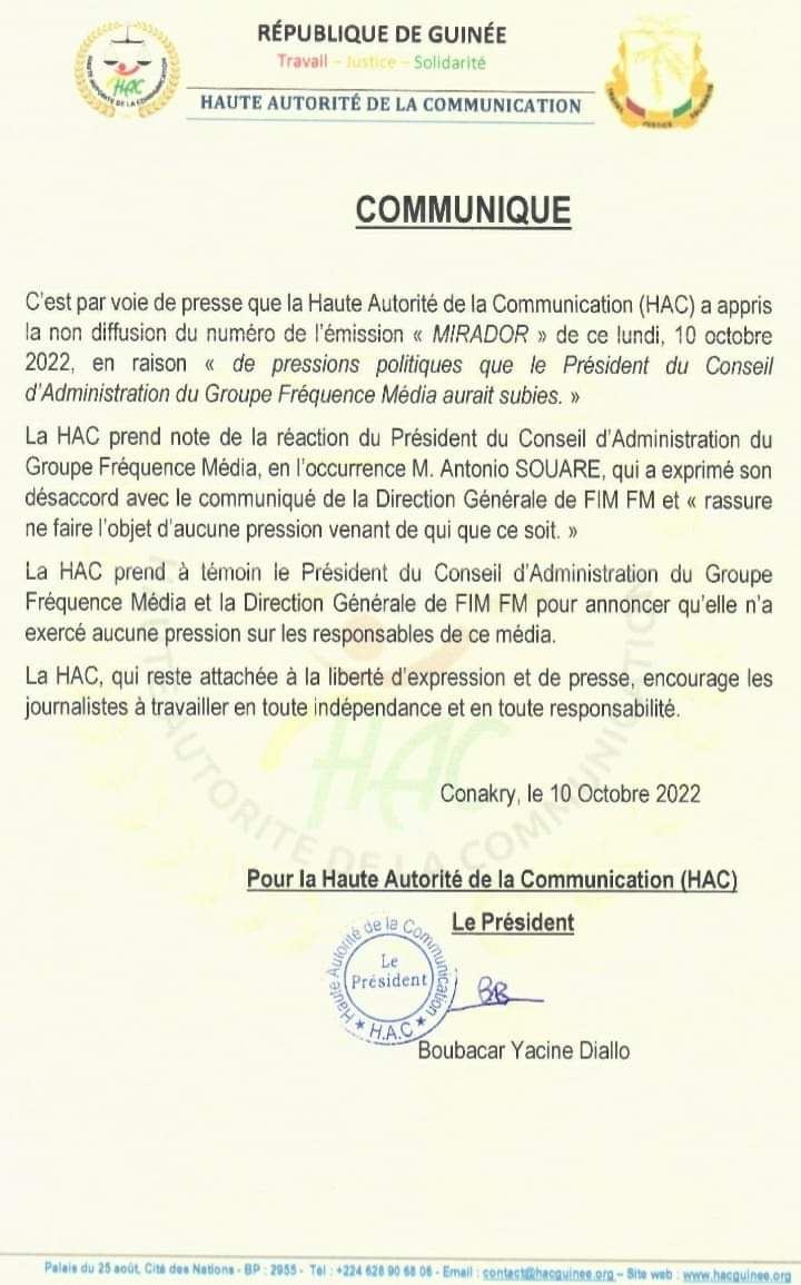 Après le communiqué du gouvernement de la transition Guinéenne et celui du président du conseil d’administration du groupe fréquence médias (GFM), Monsieur Antonio Soiré, la HAC a à son tour annoncé dans un communiqué rendu public, la dit avoir prit note du communiqué de monsieur Souare, et dans Le communiqué, dit à son tour n’avoir mis aucune pression sur monsieur Antonio Souare.