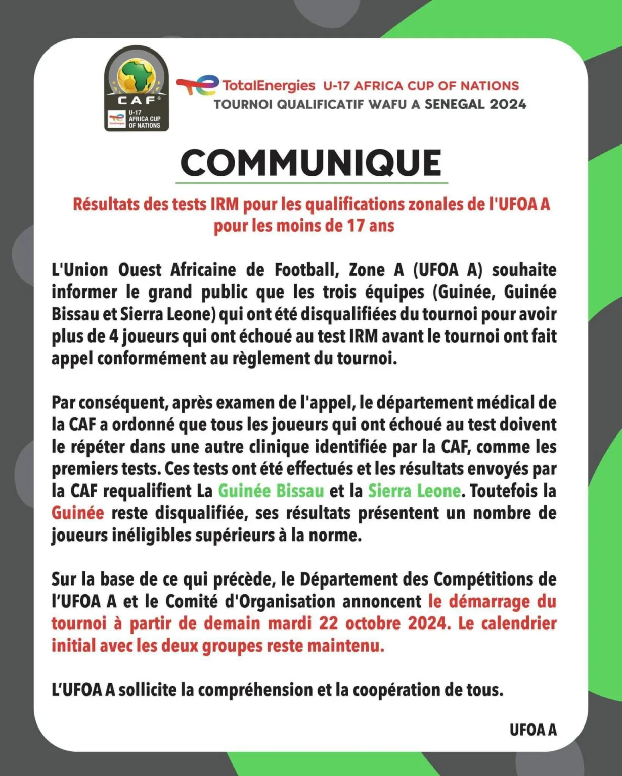 « L’Union Ouest Africaine de Football, Zone A (UFOA A) souhaite informer le grand public que les trois équipes (Guinée, Guinée Bissau et Sierra Leone) qui ont été disqualifiées du tournoi pour avoir plus de 4 joueurs qui ont échoué au test IRM avant le tournoi ont fait appel conformément au règlement du tournoi », annonce l’UFOA.