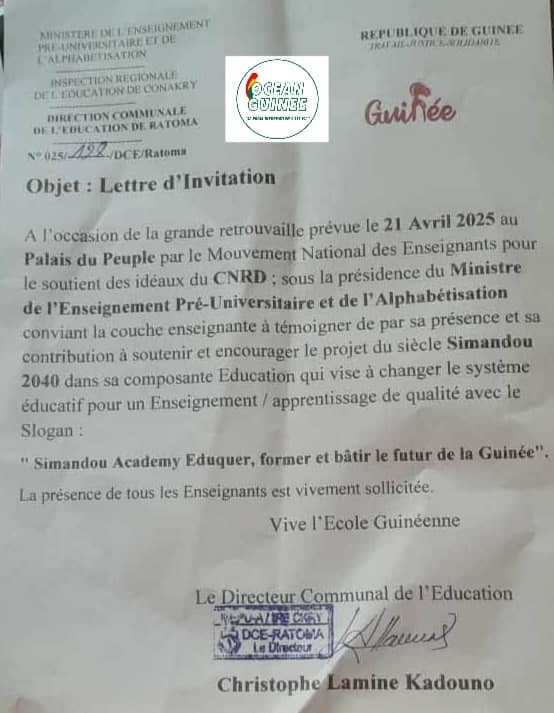 A travers une invitation non datée, le DCE de Ratoma, sous la présidence du ministre de l’enseignement pré-universitaire et de l’alphabétisation invite les enseignants de sa commune à participer activement à une grande mobilisation prévue, le 21 avril prochain au palais du peuple, sous l’initiative du Mouvement National des Enseignants pour le soutien des idées du CNRD.