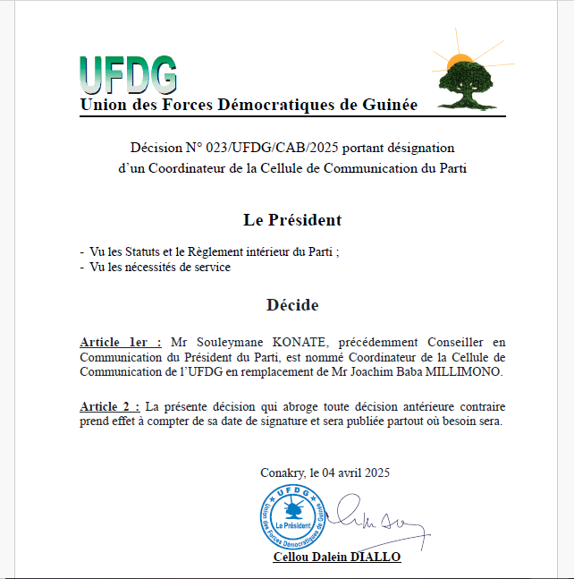 Suite au mémorandum des secrétaires Fédéraux de l’UFDG de la Haute Guinée et de la Guinée Forestière, et après que certains signataires dudit mémorandum ont présentés leus excuses et de demandés pardon au président du parti, en accusant certains cadres du bureau politique national de les induires en erreurs, et Joachim Baba Millimono a reconnu l’authenticité dudit mémo, Cellou Dalein a dans une décision dont nous avons reçus copie, procédé au remplacement de Joachim Baba Millimono à la tête de la coordination de la cellule de communication du parti.